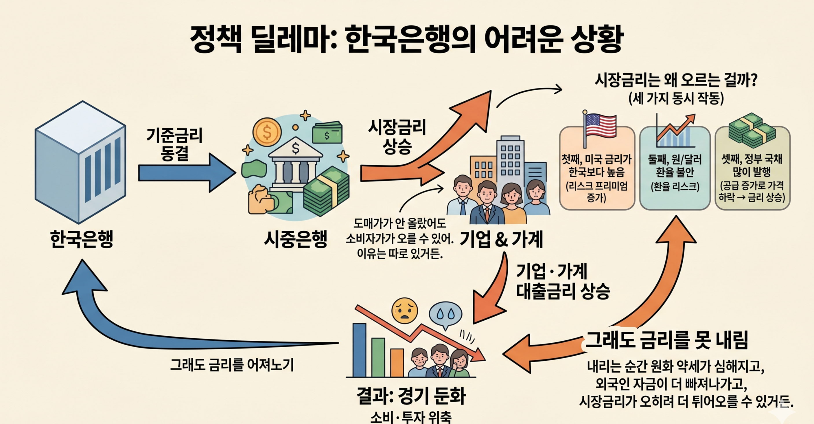 기준금리 동결 → 시장금리 상승 → 기업·가계 대출금리 상승 → 소비·투자 위축 → 경기 둔화 → 그래도 금리를 못 내림이걸 정책 딜레마라고 해. 한국은행도 지금 꽤 어려운 상황에 있어.